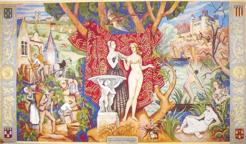 groupe de figures (Loire : allégorie, femme : beauté : nudité : bijou, femme : vêtement : Renaissance, tenture, Fontaine) ; scène (Loire, Tours : cathédrale, bateau à voiles, demeure, vendange, château, chasse à courre, barque : homme, femme : fleur, femme : livre)