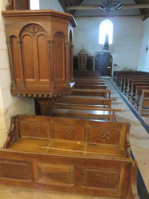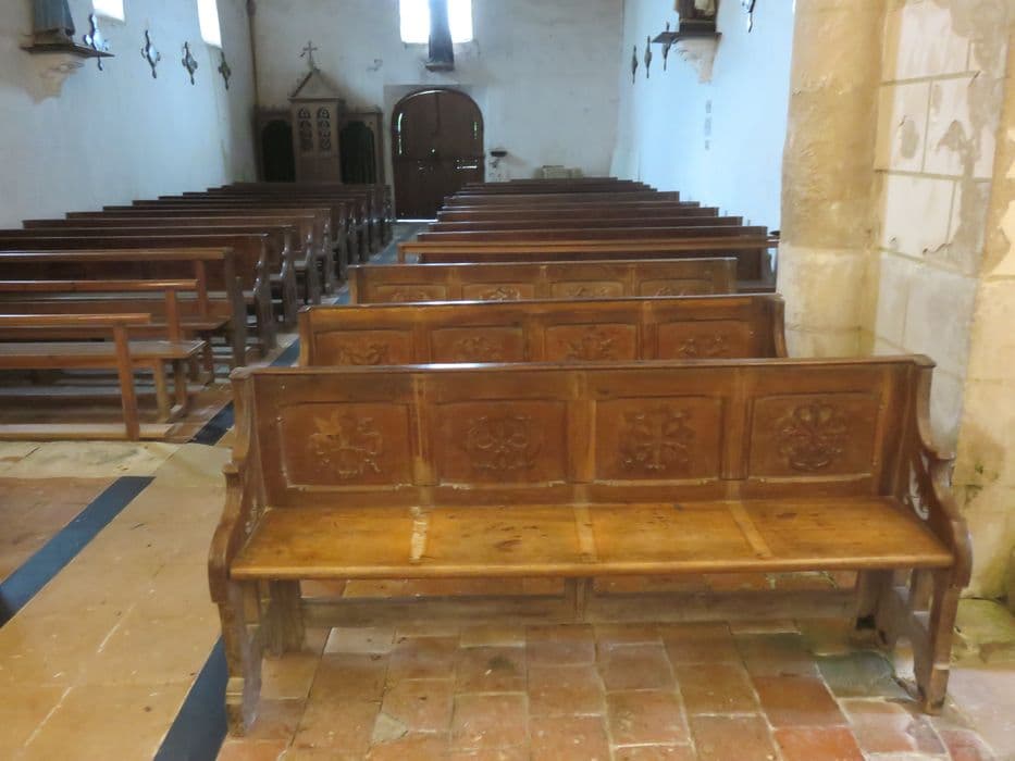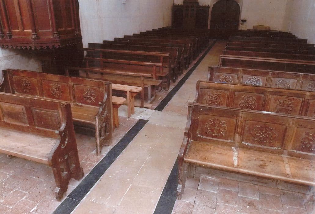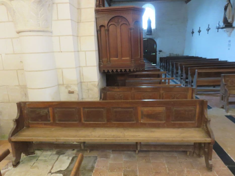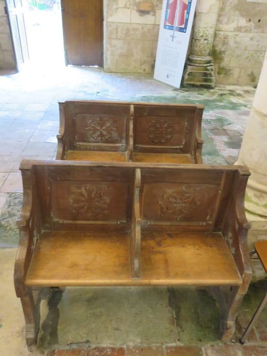ensemble de 28 bancs d'église, petits bancs agenouilloirs et plaquettes de métal émaillé