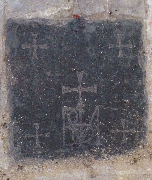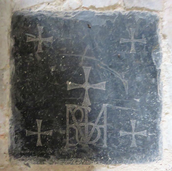 Elle comporte un décor classique de pierre d'autel, avec les croix aux angles. Elle s'orne également de lettres entrelacées, parmi lesquelles on pense pouvoir lire un M, dont la barre verticale droite sert également à former un A légèrement déformé.