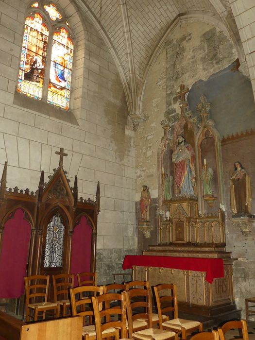 L'autel et le retable néo-gothiques ont été peints de même que le mur auquel ils sont appuyés par Eugène Subert, artiste ligolien qui a signé son oeuvre de ses initiales. Le décor et notamment les nombreuses inscriptions de dévotion au Sacré-Coeur ont été conçus par l'abbé Louis Baranger, curé-doyen de Ligueil, qui en a donné la clef dans un petit opuscule. L'abbé Baranger avait fondé à Ligueil une confrérie intitulée Garde d'honneur du Sacré-Coeur de Jésus. Le retable est garni d'une grande statue de plâtre du Sacré-Coeur et de deux statuettes d'anges portant des luminaires.