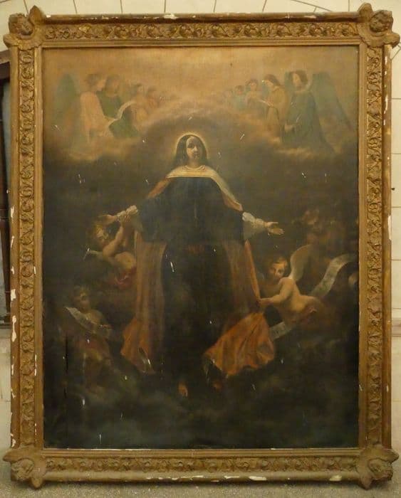 La Vierge aux bras ouverts est représentée debout sur une nuée, entourée de quatre anges. Au sommet, sur une nuée, deux rangées d’anges se font face.