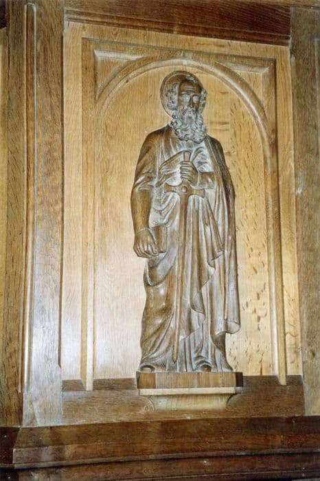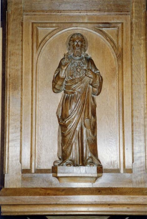 Chaire en bois sculpté. La cuve est divisée en trois arcades, portant les représentations du Sacré-Coeur, de saint Paul et de saint Pierre