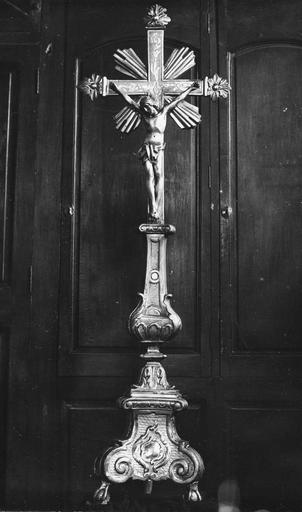 Croix aux extrémités fleuronnées et rayons. Tige balustre sur base triangulaire avec pieds à griffes.