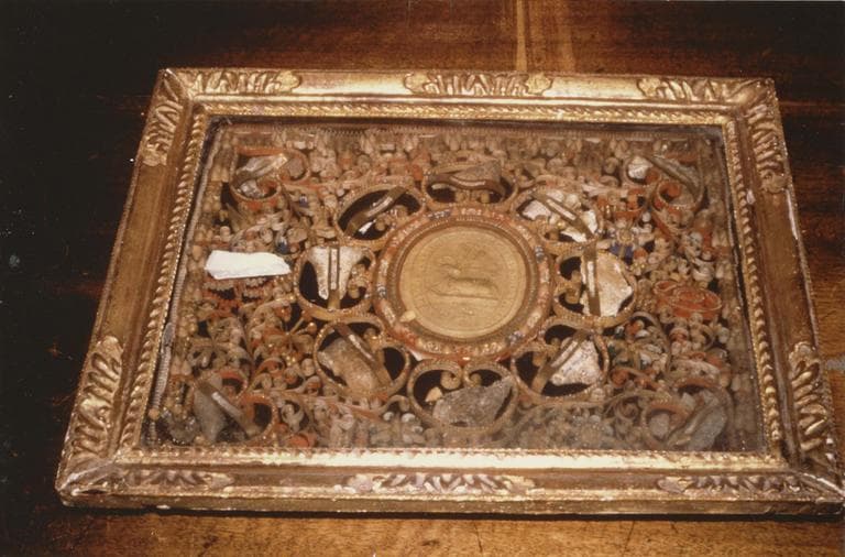 Cadre en bois sculpté et doré. Au centre du tableau, un médaillon en cire figuré d'un agneau pascal. Huit reliques disposées autour du médaillon et quatre reliques aux angles sont entourées d'un décor de papier roulés.