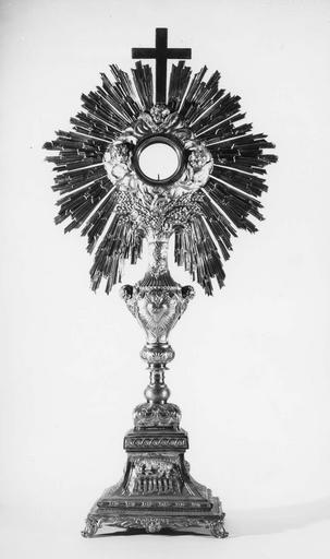Argent doré, incisé, repoussé, amati. Lunule existante, consacrée, non inventoriée. Pied rectangulaire aux 4 faces ornées : sur le panneau de face, l'agneau mystique couché sur les 7 sceaux, au dos le couronnement de la Vierge et sur les deux petits côtés la vigne ; sur le noeud : de face le coeur enflammé ceint de la couronne d'épines ; au dos blé et vigne et deux têtes d'ange ; soleil : de grands rayons émergent de blé et de vigne, trois têtes d'anges issues de nuées surmontées d'une croix. Socle reposant sur quatre petits pieds à crosettes. Socle reposant sur quatre petits pieds à crosettes.