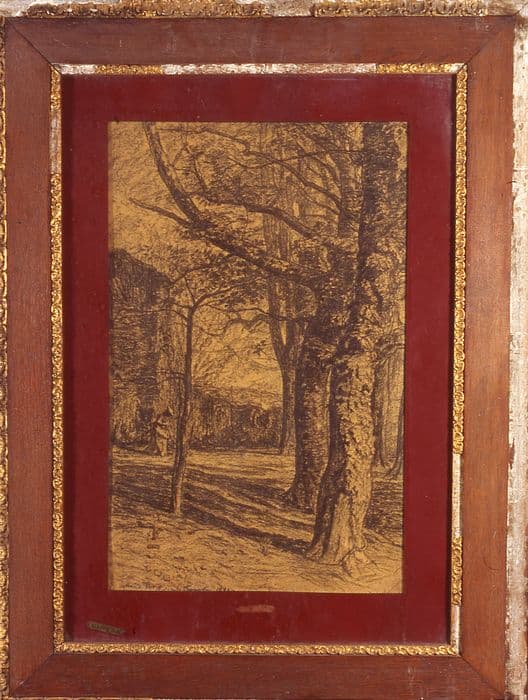 Crayon gras sur papier. Cadre en bois naturel présentant de la dorure avec passe-partout.