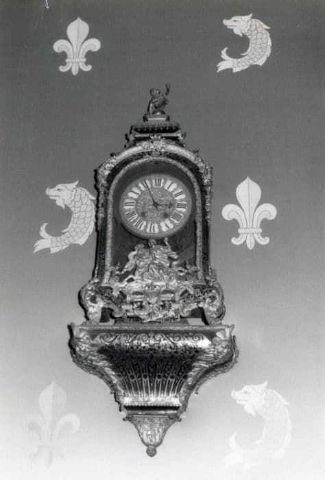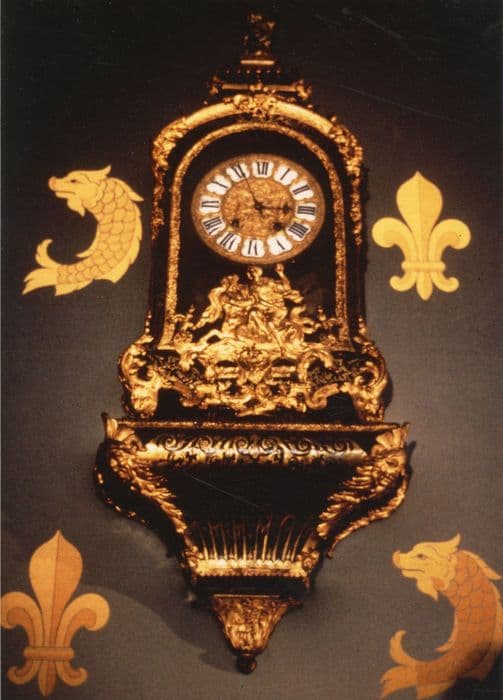 Cartel d'applique sur socle, en marqueterie Boulle de cuivre, écaille et bronze doré, reposant sur des pieds rocaille ornés de mascarons. L'objet est de plan rectangulaire et d'élévation droite en façade et légèrement galbée sur les côtés, à couronnement en dôme. La caisse est vitrée sur trois côtés. Elle renferme un balancier en bronze doré et est surmontée d'un cadran de bronze repoussé à chiffres romains émaillés.