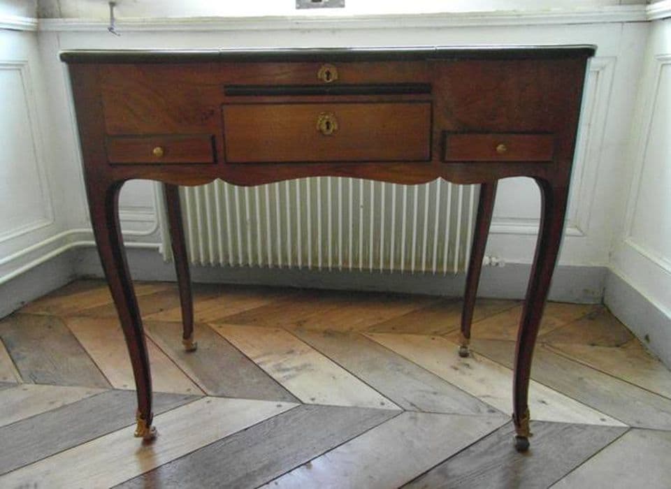 Toilette à dessus brisé, avec bâti en épicéa et placages de noyer, poirier noirci, sapin, cuir, bronze et moire, comportant un miroir à la feuille.