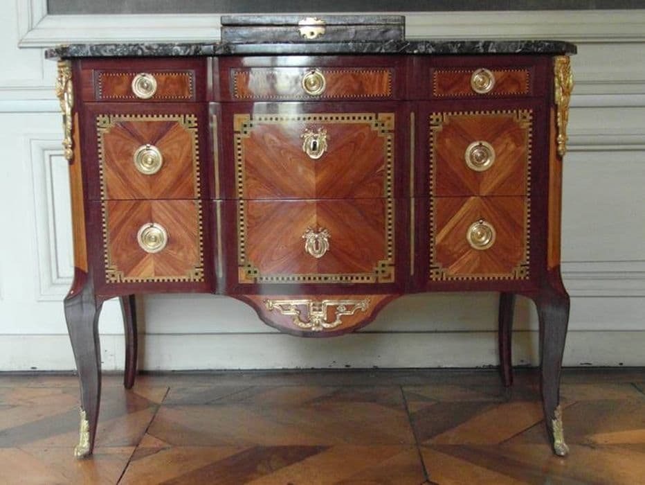 Commode à tiroirs de ceinture, présentant un bâti de chêne, avec amarante, bois de rose, poirier noirci, frêne et marbre noir veiné de blanc.