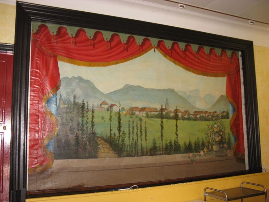 Rideau de scène avec son mécanisme d'enroulement, les quatre pendrillons et le cadre de scène.