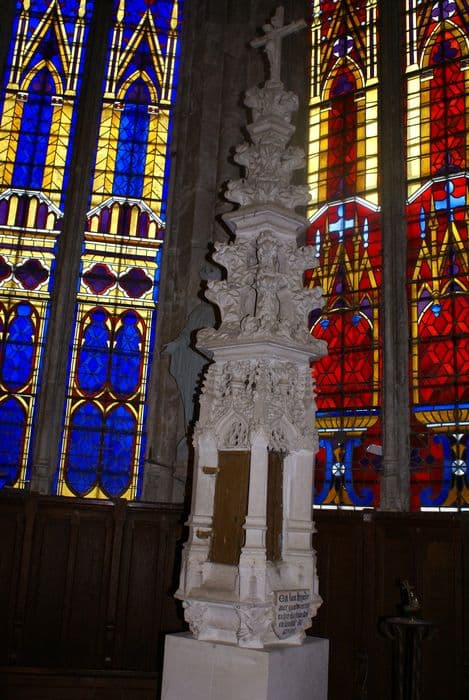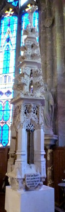 Edicule gothique en forme de flêche à quatre pans. L'étage inférieur est formé de quatre piliers ou contreforts reliés entre eux par des arcs à extrados. Une porte de chêne ferme l'armoire. La partie supérieure comprend deux étages séparés par de larges corniches, avec de petites fenêtres et des chicorées dans les angles.