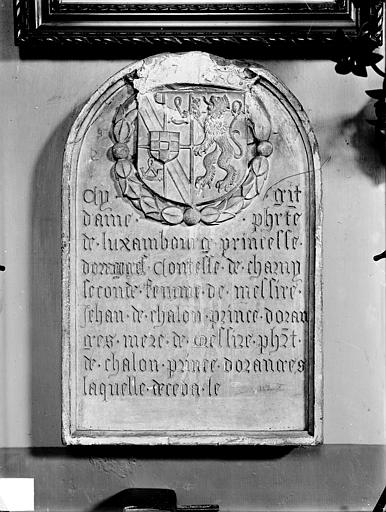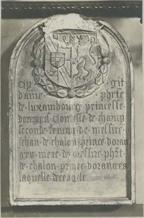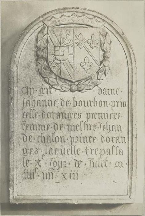 Armoiries : armes des deux princesses, mi-parti Bourbon et Chalon pour Jeanne de Bourbon (au-dessus de chaque inscription). Epitaphe : Cy git dame Jehanne de bourbon princesse doranges premiere femme de messire Jehan de chalon prince doranges laquelle trepassa le X jour de julet M IIII IIII XIII (épitaphe de Jeanne de Bourbon, en minuscules gothiques). Epitaphe : Cy git dame ph (?) te de luxambourg princesse doranges contesse de charny seconde femme de messire Jehan de chalon prince doranges mere de messire ph (?) t de chalon prince doranges laquelle deceda le (épitaphe de Philiberte de Luxembourg, en minuscules gothiques).