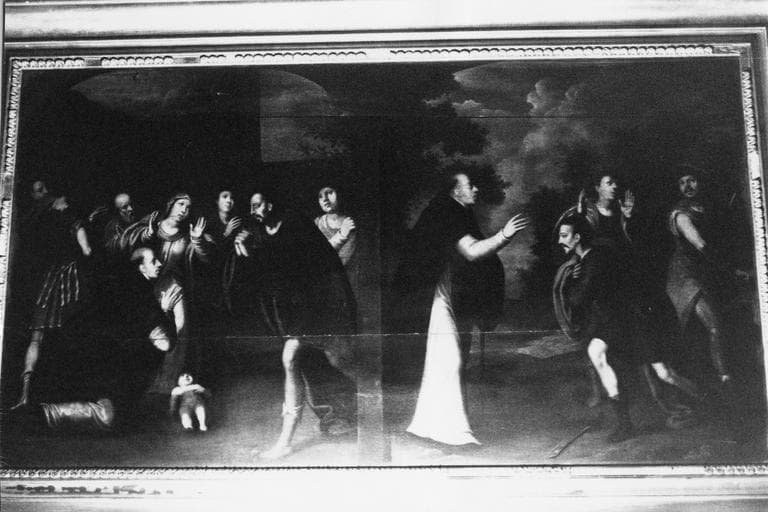 Les deux scènes sont : saint Dominique rend la vie à un enfant, et il convertit les sicaires qui voulaient l'assassiner.