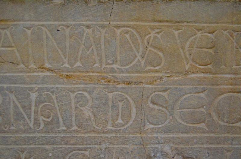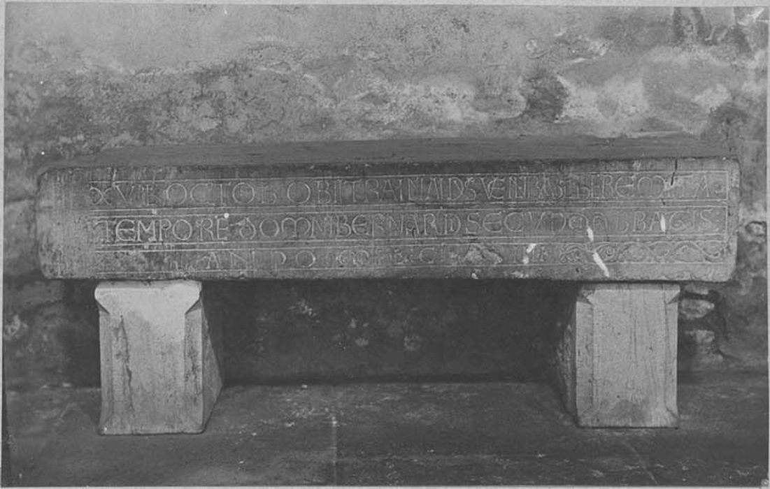 Inscription (latin) : XVI Kalendas octobr obiit Rainaldus venerabilis heremita Tempore Domini Bernardi secundi abbatis Anno mil C IIII (trois lignes en majuscules onciales et romaines).