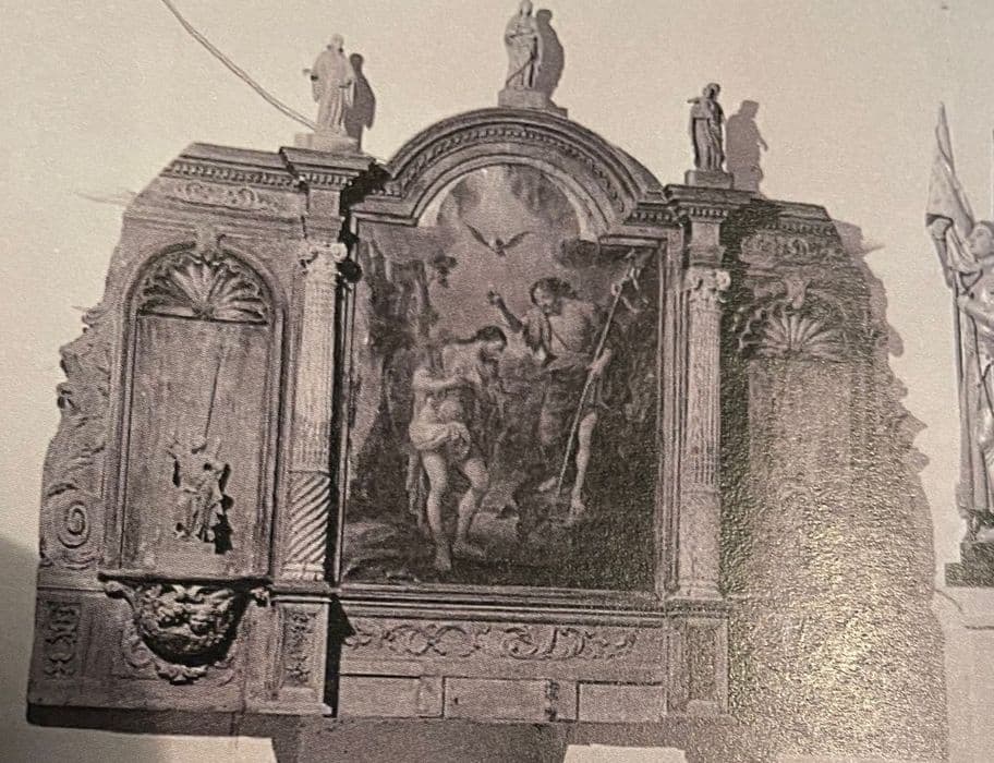 retable des fonts baptismaux, cinq statues et tableau : Le Baptême du Christ