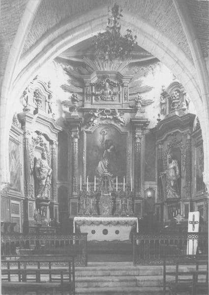 Ensemble fonctionnel composite ; le retable date sans doute de la fin du 17e siècle ; l'autel, le tabernacle et l'exposition, de style rocaille, sont postérieurs et ont peut-être été conçus pour l'autel latéral nord (dédié au Sacré-Coeur) ; les deux tableaux latéraux du retable (saint François de Sales, saint Charles Borromée) furent peints par Fidel Gudin, de Pau, en 1836.