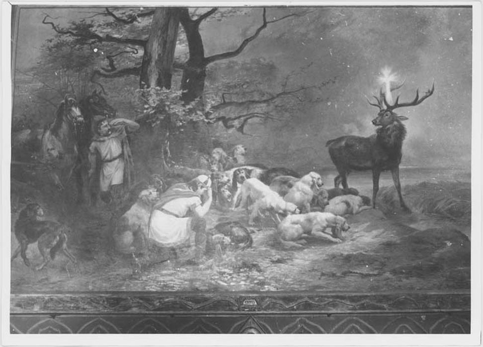 Toile représentant la conversion de saint Hubert. La chasse est en arrêt devant le cerf entre les bois desquels resplendit la croix. Saint Hubert est agenouillé. A l'arrière se trouvent le piqueur et les deux chevaux. Au milieu de la toile apparaît la meute de chiens. Les deux grands arbres du milieu et l'obscurité du ciel contribuent à accentuer le caractère tourmenté de la scène. Le peintre se montre surtout animalier : chacun de ses chiens a une attitude particulière.