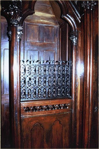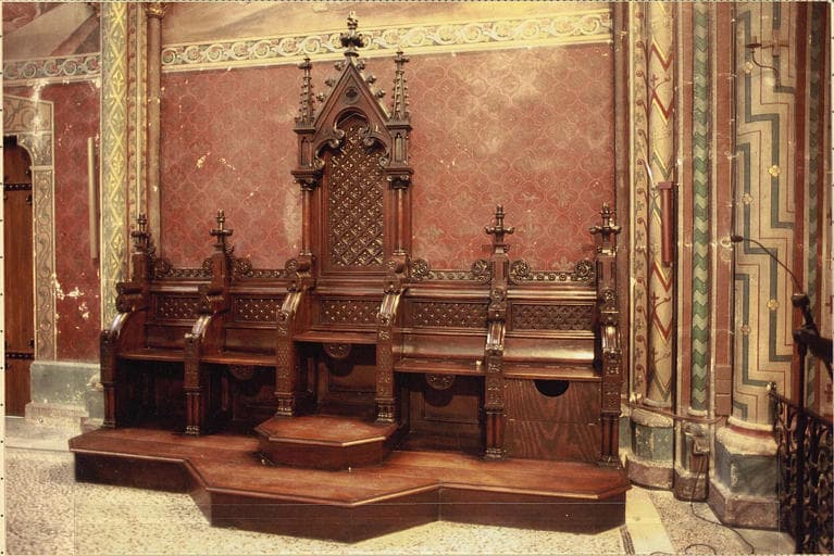 chaire à prêcher ; confessionnal ; banc d'oeuvre ; siège de célébrant ; lutrin