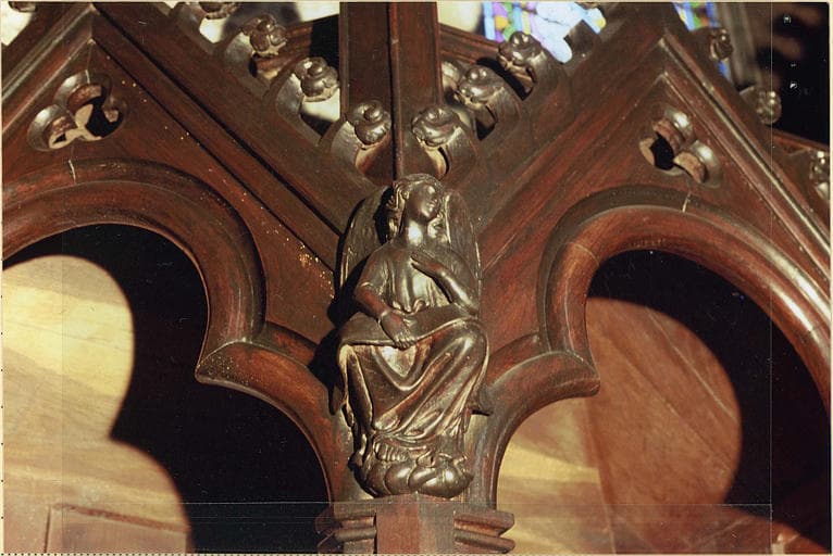 Banc d'oeuvre à sept travées, sièges de célébrants composés de cinq stalles chacun avec pinacle central.