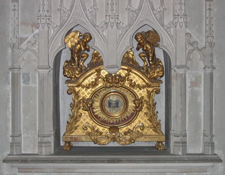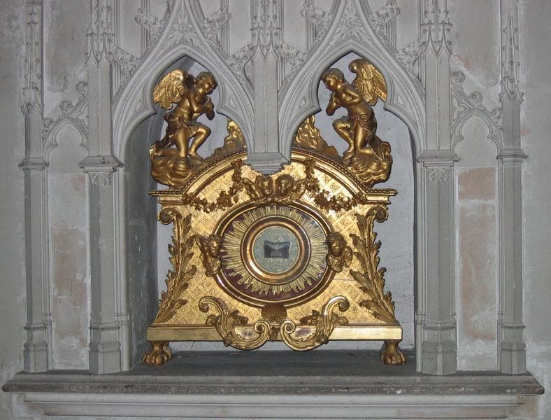 Paire de châsses reliquaires. La relique apparaît dans un présentoir circulaire encadré de rais de soleil, à l'intérieur d'un oculus ovale, encadré et sommé d'angelots.