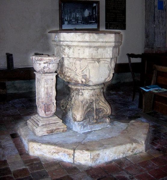 La cuve baptismale, octogone, est ornée sur sa face principale d'un écusson découpé porté par deux angelots. Pieds aux quatre angles ornés de feuillages. Petite cuve ovale reposant sur un socle rectangulaire et une base moulurée.