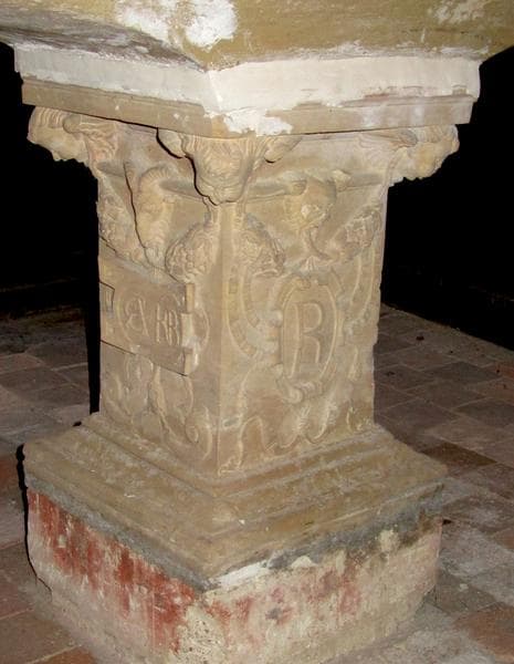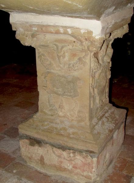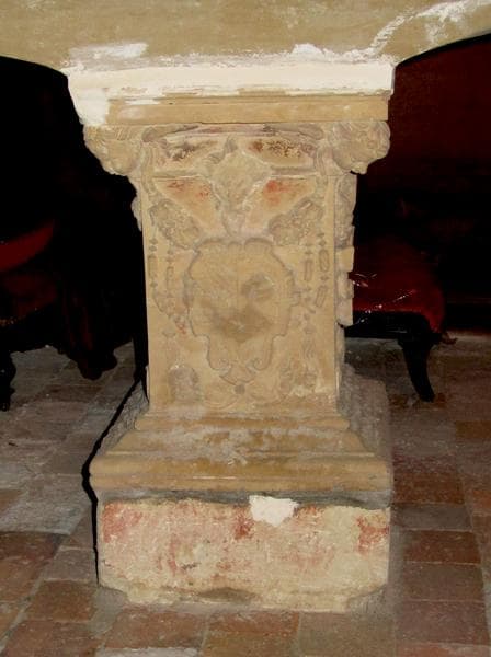 Socle carré en plan, portant un support de cuve à base moulurée, dont le fût est orné de sculptures.