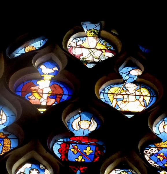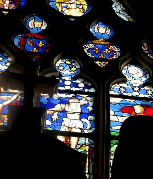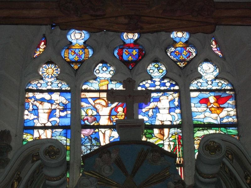 La partie inférieure de la fenêtre a été murée pour y adosser un grand retable du 17e siècle. La partie subsistante, divisée par les meneaux en quatre parties, est consacrée à la Crucifixion.