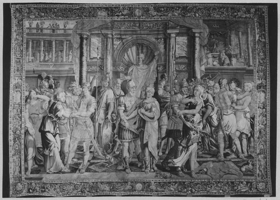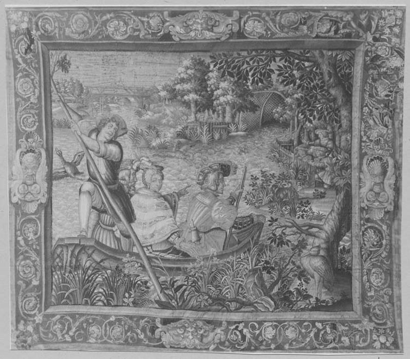 Ancienne collection La Forest-Divoune (acquisition le 26 juillet 1938). Acquises avec le concours de la CNMH. Cette suite de tentures est citée dans les inventaires (1627) des ateliers de Paris de François de La Planche et des séries perdues existaient aussi dans le mobilier de Versailles jusqu'en 1789 et chez celui de Cinq-Mars et de l'abbé d'Effiat en 1643. Mais cette tenture était restée inconnue de Fenaille et provient avec certitude du château d'Uriage (Isère) dont elle ornait les salons. Les cartons seraient l'Oeuvre du peintre Laurent Guyot qui vivait au 17e siècle et se serait inspiré de modèles du 16e siècle.