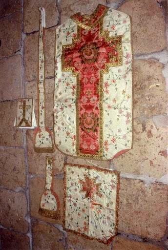 chasuble ; manipule ; voile de calice ; étole de clerc ; bourse de corporal