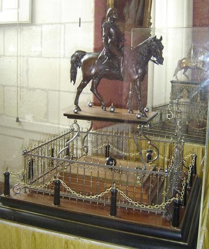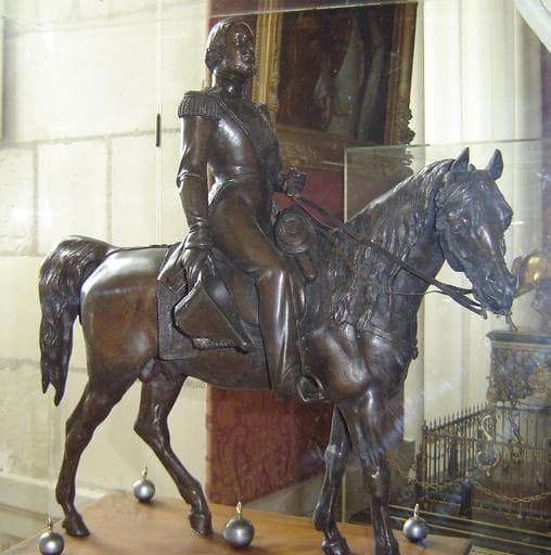 statue, socle, piédestal : portrait équestre du comte de Chambord sur un socle en bois à volutes, sur un piédestal en bois encadré de grilles en laiton et fer, et de chaînes