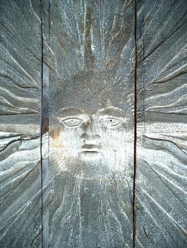 Panneau sculpté d'un soleil à visage humain, environné de rais et de rayons de Saint-Bernardin.