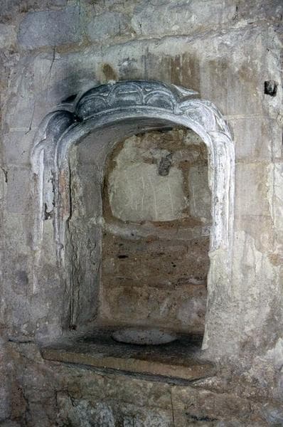 Lavabo en niche (?) dont l'encadrement est fait de deux colonnettes soutenant une arcature polylobée.