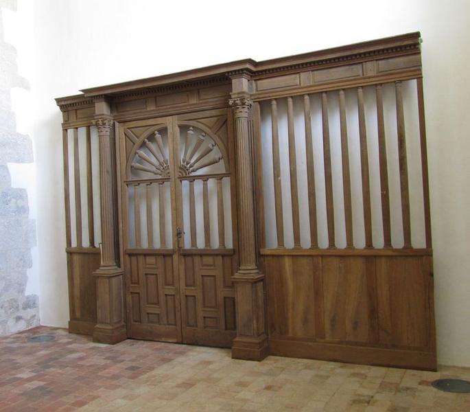 Ancienne clôture de chapelle seigneuriale, elle a été déposée au 19e siècle pour être adaptée en clôture entre la nef et la salle basse du clocher. Lors de la restauration de l'église en 2006-2007, cette clôture a été démontée pour être entreposée le long du mur de la salle du clocher. (Source : Dominique Menanteau, CAOA de Loir-et-Cher).
