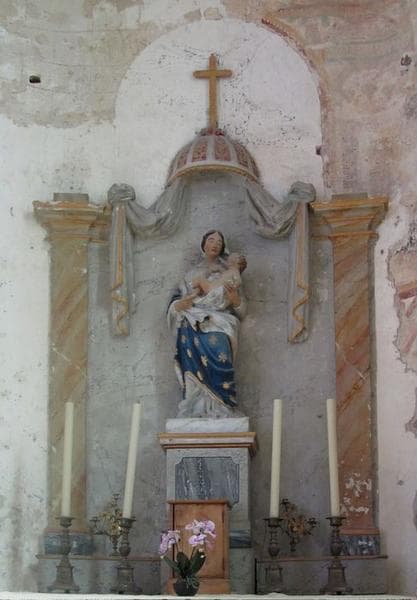 La statue du retable est surmontée d'une sorte de baldaquin en pierre et en plâtre.