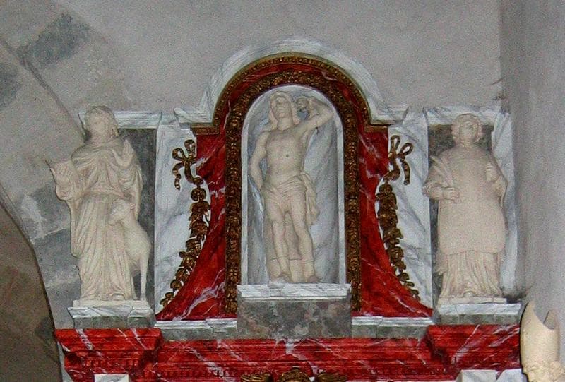 trois statues : Saint Sébastien, Saint Luc (Saint Jean ?) et Saint Vincent