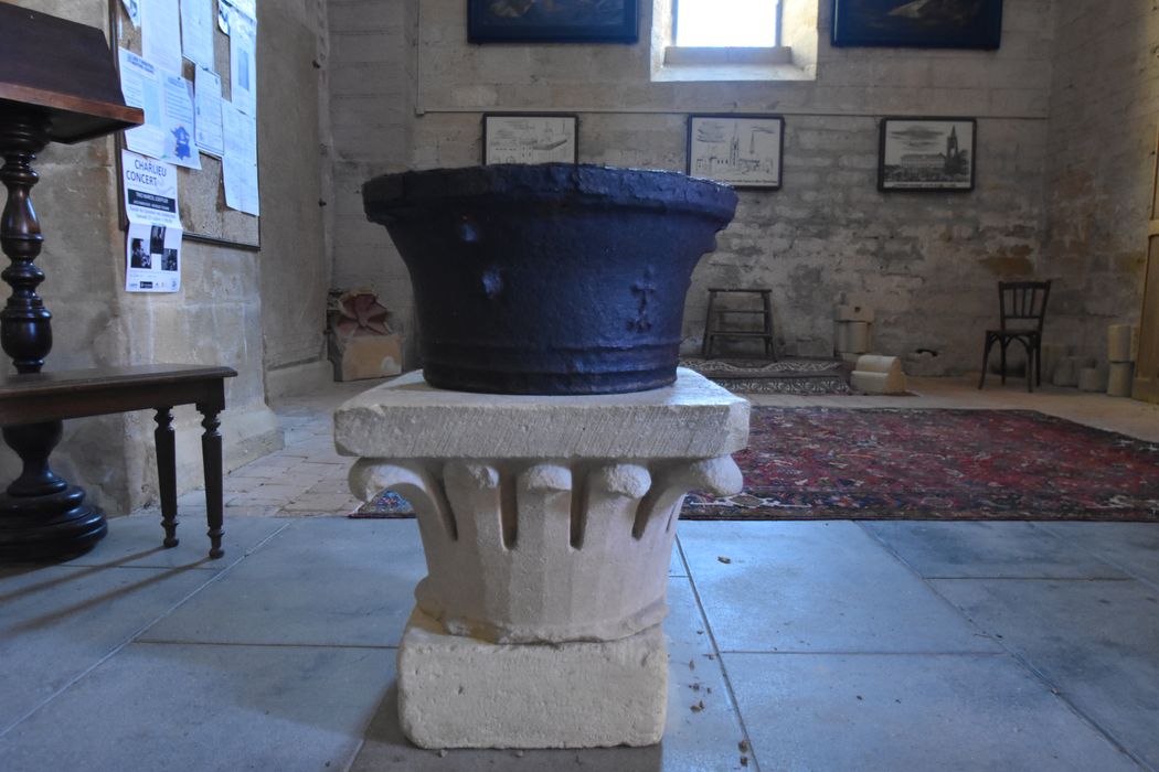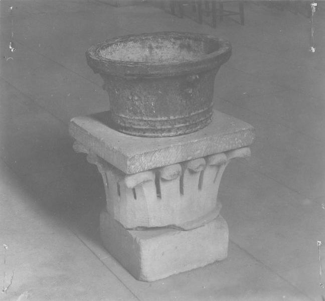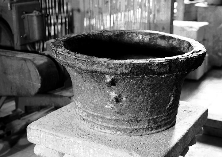 La cuve circulaire est légèrement évasée, primitivement munie de trois anses, actuellement cassées. En haut, le bord épais est raccordé à la cuve par une courbe ; en bas, trois filets. Sur le côté, une croix latine dont le pied est dans un segment de cercle.