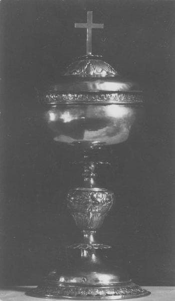 La croix qui surmonte ce ciboire paraît moderne. En dessous d'elle, le couvercle est formé de trois parties superposées : un calotte posée sur un tore uni et le rebord qui recouvre le bords de la coupe. Celle-ci, à la calotte peu profonde, est unie. La tige est formée d'un noeud entre deux bagues. Le pied, à la calotte aplatie, est posé sur des feuilles d'eau qui reposent par leur pointe sur le cercle de base et laissent ainsi des jours entre elles.