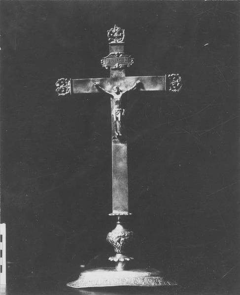 La croix, faite de feuilles d'argent, a pour section un rectangle de peu d'épaisseur. Le Christ, les fleurons des trois extrémités supérieures, le titulus, sont fondus et ciselés. La croix repose sur un pied en argent repoussé composé d'un noeud entre deux collerettes. En dessous se trouve une calotte ovale très aplatie.