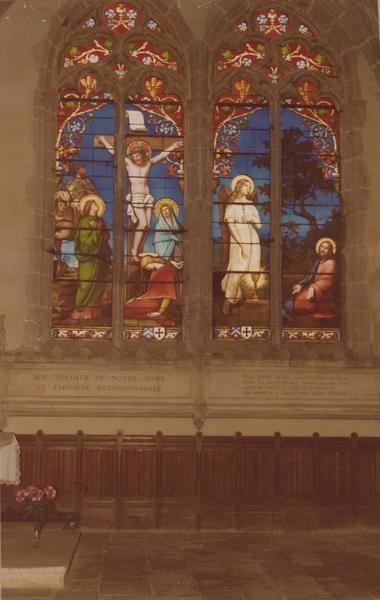 Baie géminée à doubles vitraux indépendants et remplages garnies de verres rouges à rinceaux de feuillage. A gauche, le Christ en croix, la Vierge et les Saintes Femmes. A droite, le Christ au jardin des Oliviers et un ange lui montrant le calice de l'Eucharistie, symbole du salut du monde.