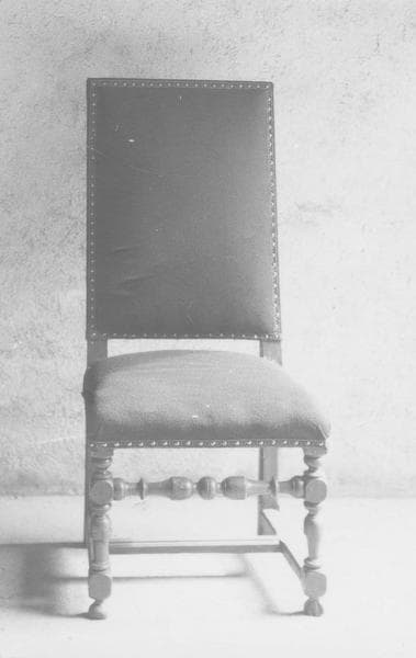 Le dossier est carré en haut, garni d'étoffe. Les pieds et la traverse de devant sont tournés. La traverse en H est seulement moulurée. Le pied de derrière n'est pas orné.