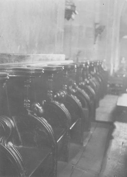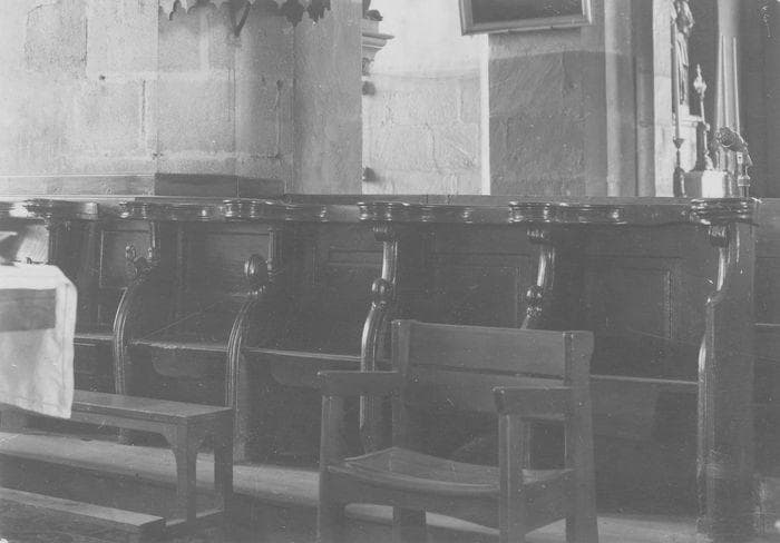 Chaque place montre en haut une triple moulure très saillante, soutenue en avant par une colonnette avec chapiteau et base moulurés. Le bas de la colonnette s'appuie sur une partie saillante en quart de rond, qui continue la séparation entre les places.