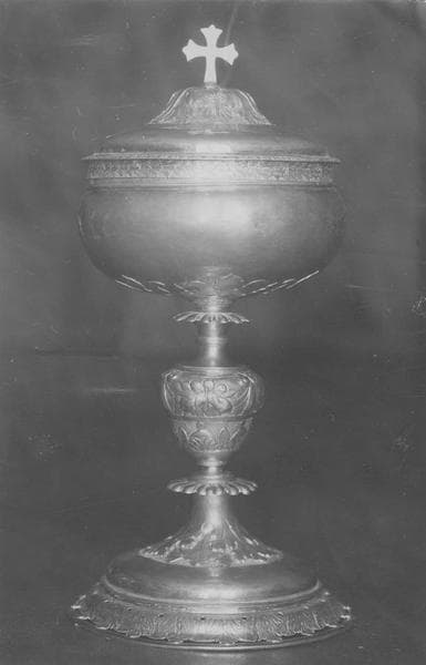 Sous la croix, une partie conique décorée de feuilles d'eau surmonte une calotte aplatie beaucoup plus large, unie. Un bord saillant et une partie verticale, ferment le couvercle sur la coupe. Une partie conique fait le raccordement de la tige avec la calotte très aplatie.