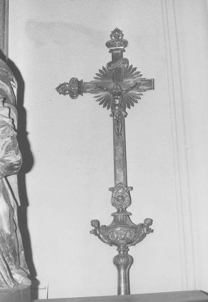 La hampe de la croix est en deux morceaux démontables. Le noeud indépendant, support du croisillon proprement dit, est en laiton doré assez finement ciselé. Le croisillon lui-même est argenté avec des fleurons dorés dont un manque au croisillon de droite. Un nimbe rayonnant entoure le Christ.