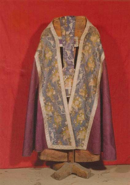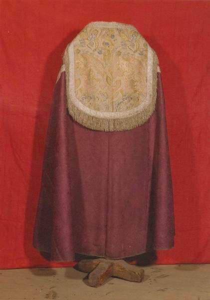Chape de damas violet dont le chaperon est constitué d'un tissu broché en satin crème, avec fleurs et rinceaux de nuance adoucie, tranchant avec le damas violet et les orfrois en soie à fond bleu damassé avec bouquets alternés vert et rose précisant l'époque Louis XV de l'ensemble. Les orfrois sont galonnés d'argent. Le tissu lamé des orfrois a été disposé en opposition au chaperon.