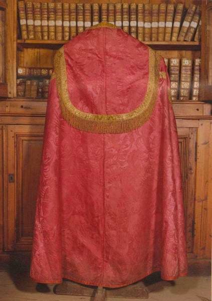 Cette chape de grandes dimensions en damas rouge représenterait un décor baroque italianisant. Le chaperon est souligné d'un large galon d'or avec frange d'or. Sur le devant, le galon forme orfroi. Décoration de fleurs et corne d'abondance.