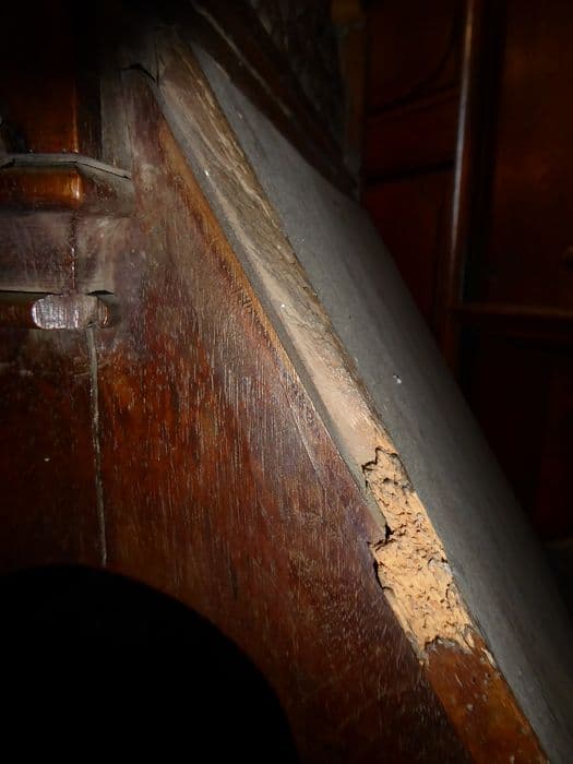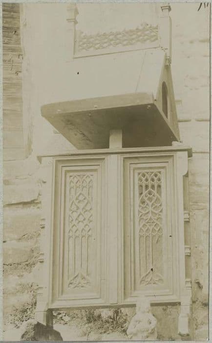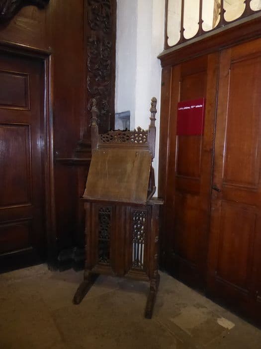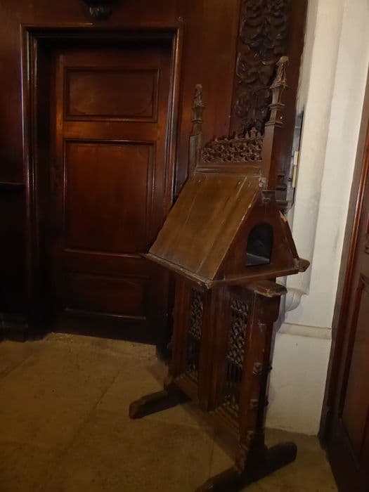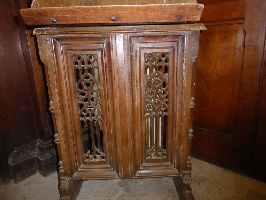 Panneaux percés de fenestrages assemblés entre deux montants portant sur des patins. Pupitre triangulaire surmonté d'une crète repercée à jour comprise entre deux pinacles.