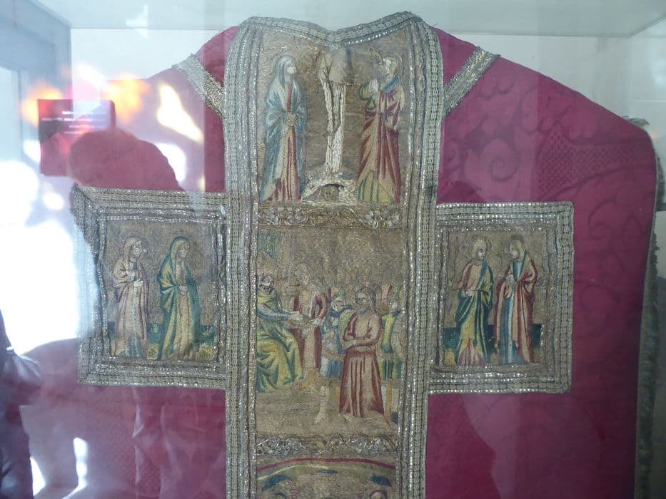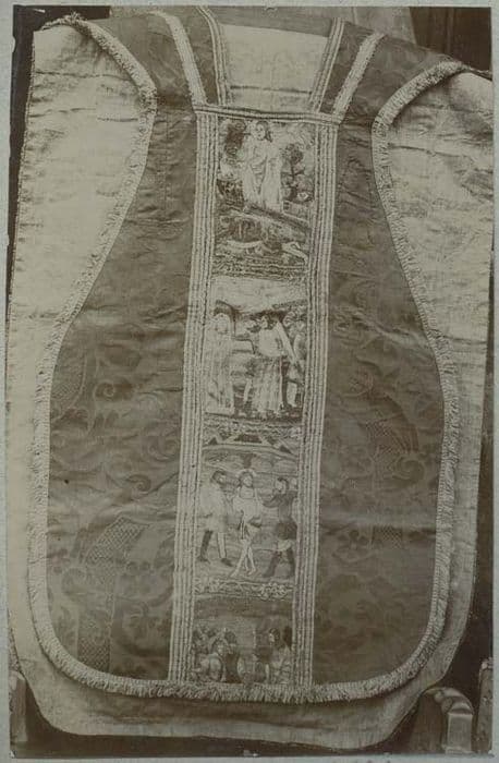 Chasuble représentant plusieurs scènes de la Passion. Broderie polychrome (orfrois) du 16e siècle, sur fond de soie du 18e siècle.