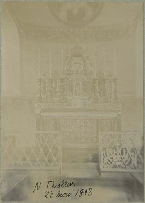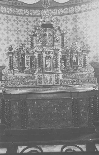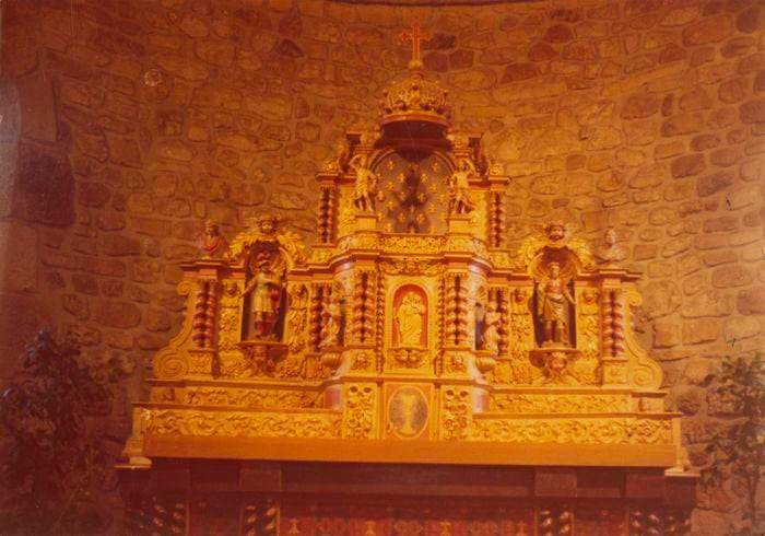L'étage inférieur, disposé pour recevoir les chandeliers, est orné de rinceaux en relief. Au dessus, il est divisé en trois parties. Au centre et en avancement se trouve le tabernacle. De chaque côté, posé sur un cul de lampe, un ange en adoration. Le tabernacle est surmonté d'une niche où deux anges en forme de cariatides soutiennent une couronne fermée. En retrait de chauqe côté du tabernacle, une niche contient une statuette de saint. Quatre groupes de deux colonnettes torses limitent à droite et à gauche les deux étages de ce retable.