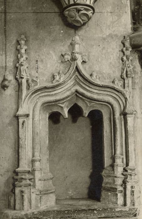 Sous une accolade, formée de quatre moulures et surmontée de quatre crochets et d'un fleuron, la niche s'ouvre assez profondément sous un arc trilobé. L'accolade s'appuie sur deux pilastres prismatiques surmontés de clochetons terminés par un fleuron. Un boudin assez saillant agrandit la table, amorti en dessous par un congé.