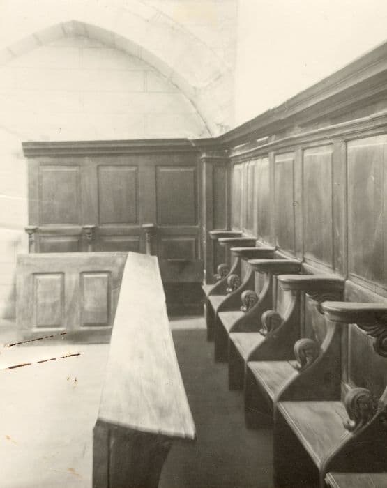 Vingt-deux stalles de choeur. Chaque place est délimitée par un accotoir orné en haut d'une spirale et en bas d'un crochet. Les sièges ont des miséricordes simples.